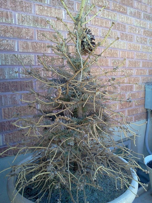 The cute little tree sat on my porch all winter, spring and summer. Things were going really well until a couple of weeks ago when I noticed that the pine needles on the outer branches were turning brownish orange. I called and spoke to an expert at a local garden center who told me that the intense heat hitting my west-facing porch had probably scorched the tree.