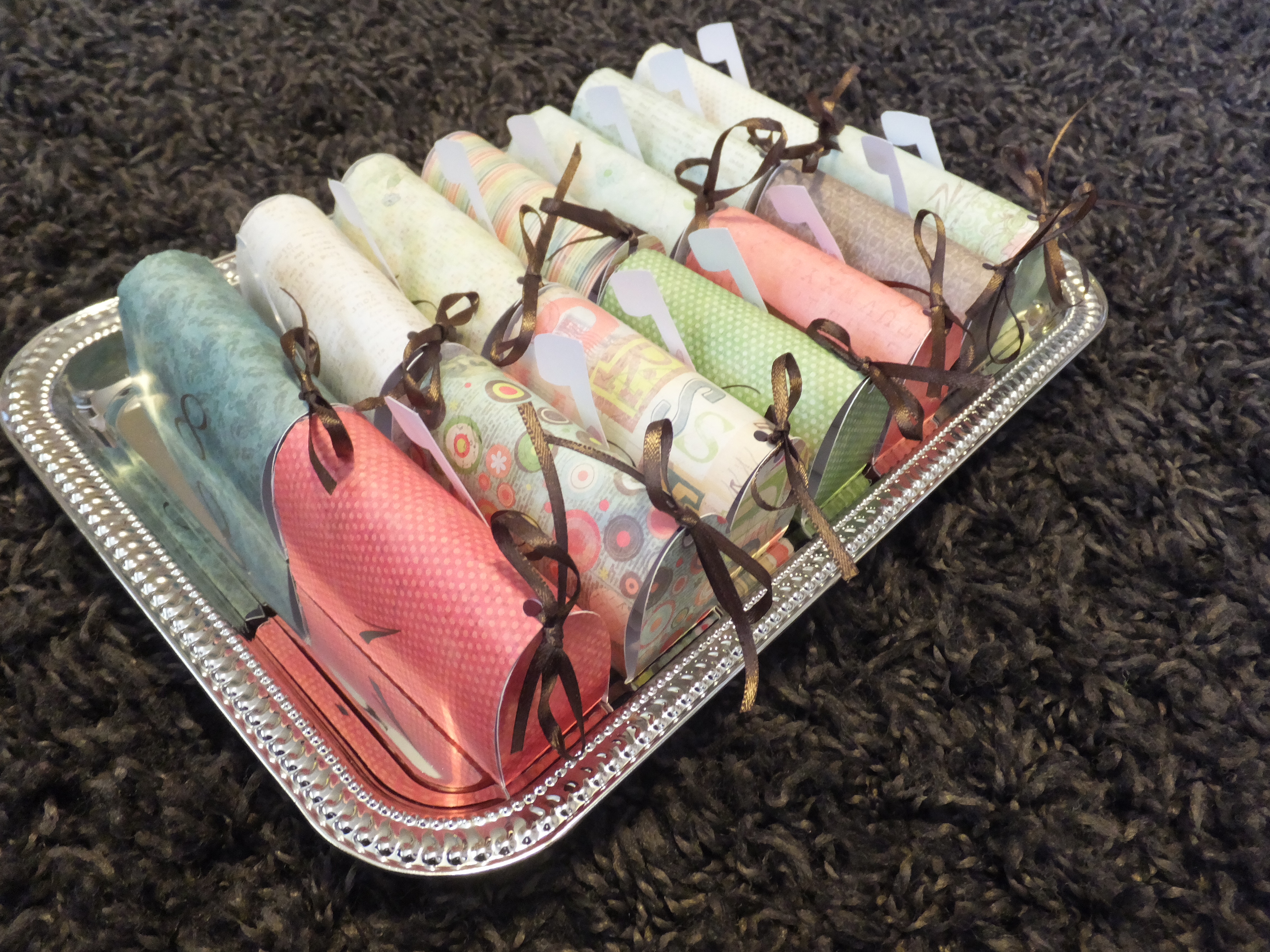 They were so funny! I cut the notes out, rolled them into tiny scrolls and then put one in each mailbox.
