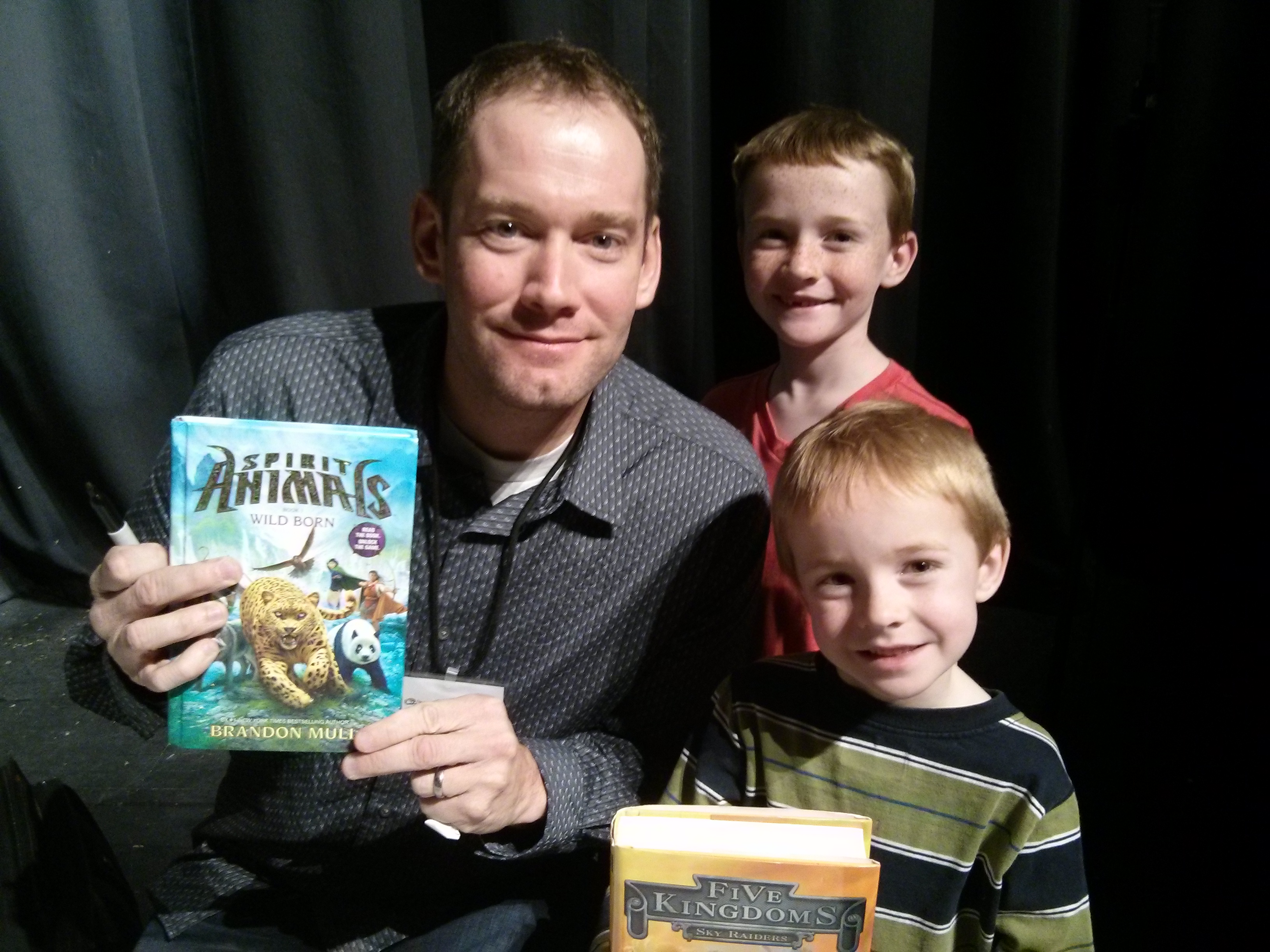 Brandon Mull was so nice. We joked with him that his hand must be killing him and he stood up and stretched. He smiled and posed in a picture with my boys.