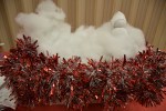 We decorated the tables with white plastic tablecloths, red fabric runners, wrapped boxes, vases with red and gold ornaments in them and “It’s a Wonderful Life” plaques. We had several wooden circles left over from a previous activity so we painted them like chalk boards then I used this downloadable image to cut out some vinyl for the plaques. On the back we put a couple of quotes from the “It’s a Wonderful Life” movie.