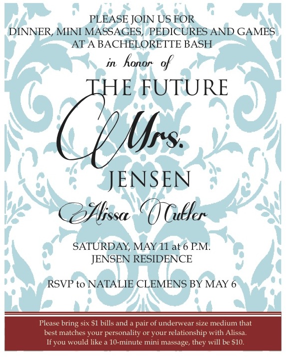 If you notice, on the bottom of the invite it asks each guest to bring six $1 bills and a pair of underwear that best matches their personality or relationship with my sister. Those pieces were essential to our games.
