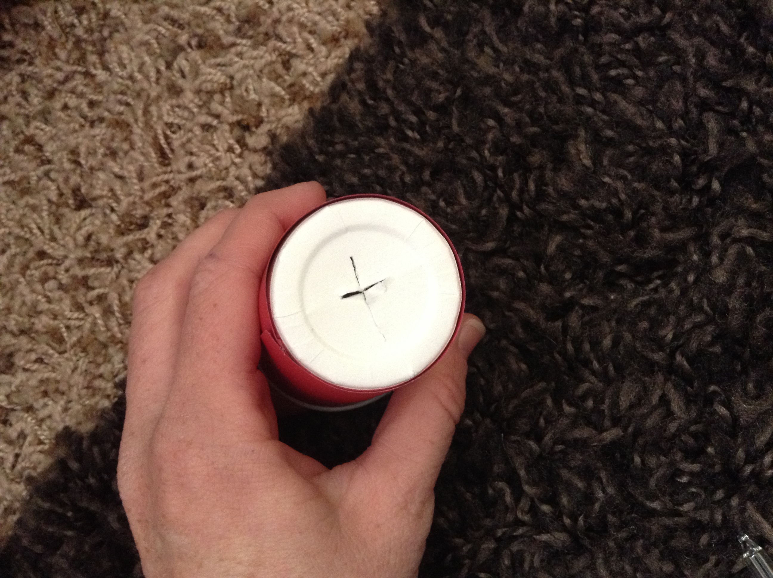 After I had all of the cups covered in red paper – I did a few in blue that I had left over from the Miss to Mrs. banner – I grabbed a kitchen knife and started cutting small x shapes in the top of the cups.