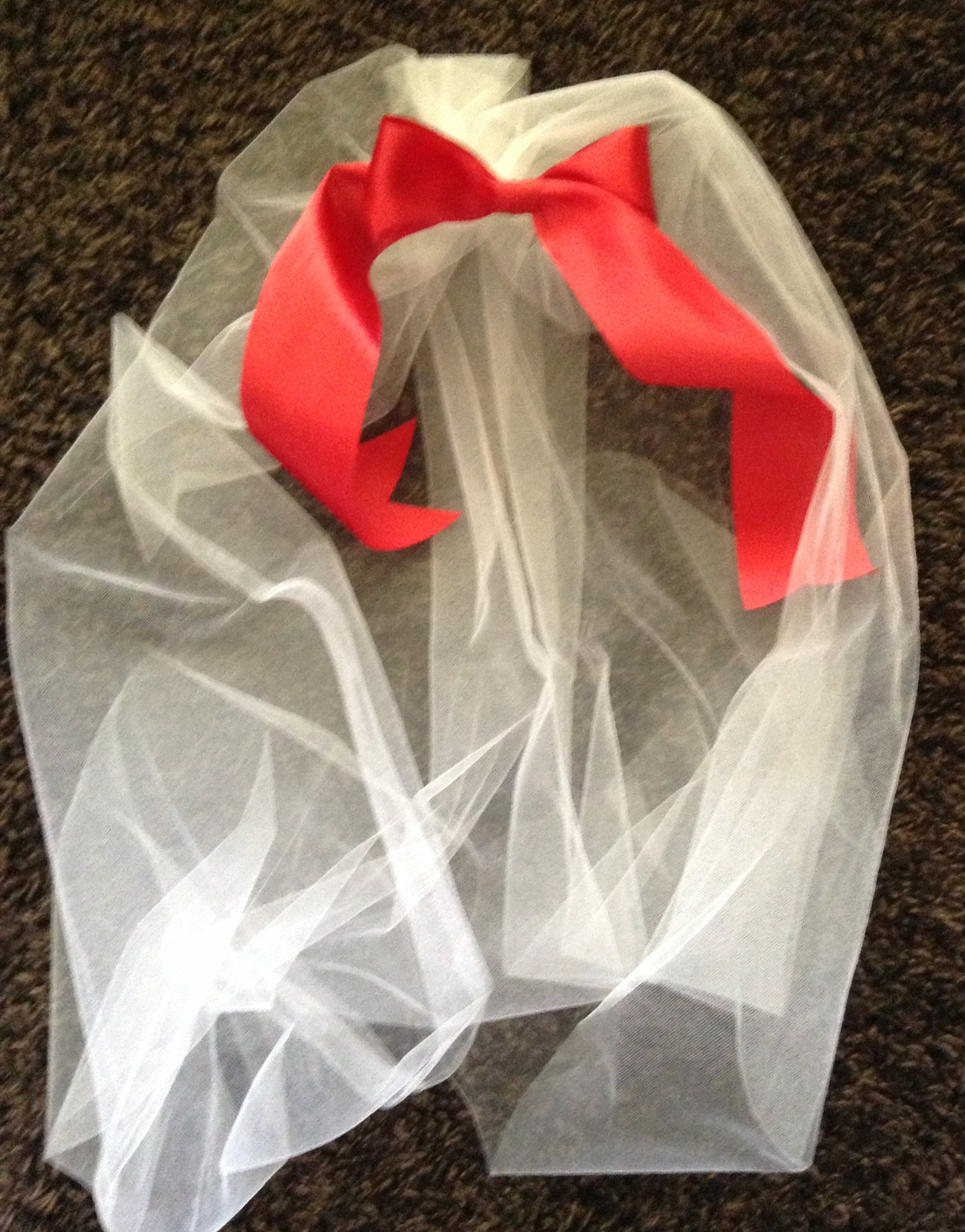 What’s a bachelorette party without a tacky veil? I had left over 2” ribbon so I tied a giant red bow.
